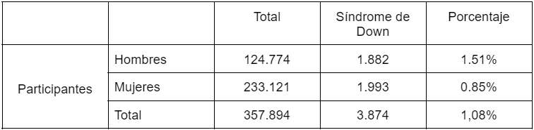 En la siguiente tabla se ve reflejado el número de personas con síndrome de Down en España (Datos sacados del Instituto Nacional de Estadística).